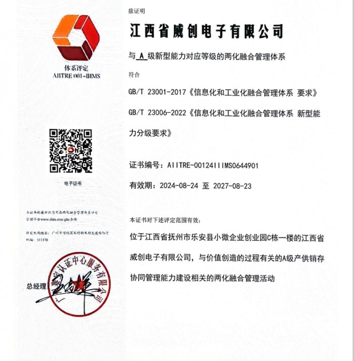 证书介绍 2013年8月,崴创电子(香港)有限公司在香港注册,同年成立乐安县崴创电子有限公司,2019年6月改名为江西省威创电子有限公司,公司坐落于江西省抚州市乐安县中小企业创业园C栋,专注于磁性元器件的精密制造,公司自主研发、生产和销售产品包括电源变压器、开关电源变压器、电感等多个系列的磁性元器件产品,这些产品广泛应用于信息与通信、工控、轨道交通、消费类电子、新能源、计算机、高端电子仪器设备、汽车电子等高科技领域。经过威创人多年不懈的努力,积累了大量磁性元器件产品生产应用经验,公司研发中心已评为市级技术创新中心、每年获得多项技术专利,同时汇集了一批来自本行业的日资、台资和港资等知名上市企业的管理人员及经验丰富的产品研发技术人员,组建了一支具有高效、高质、高凝聚力的核心团队。