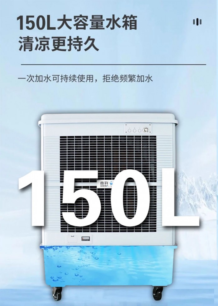 雷豹移动冷风机MFC16000D采用三面冰帘降温,原浆水帘纸,无毒无味,大面积降温急速降温,轻松享受清新空气;超大增强尼龙材质扇叶,强度高,稳定扇叶,强劲送风;400W超大功率凉爽整个大空间,三扇涡轮式巨幅扇叶,延长送风距离,全方位促进空气对流;超广角送风,确保清凉的气息充满房间的每一个角落;优质六级电机,以低耗电获得更强劲的动力,可长时间高效运转时自动待机保护,安全放心;150L水箱制冷一整天免加水;智能触控,一目了然的面板 简洁易懂的操作;万向刹车滑轮,360度方便移动,前轮带刹车,防止随意跑动。